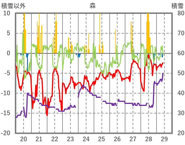 | 日 | 時 | 気温 | 降水 | 風向/風速 | 日照 | 積雪 | 降雪 |
