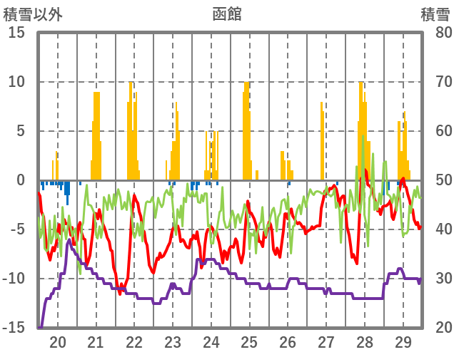| 日 | 時 | 気温 | 降水 | 風向/風速 | 日照 | 積雪 | 降雪 |
