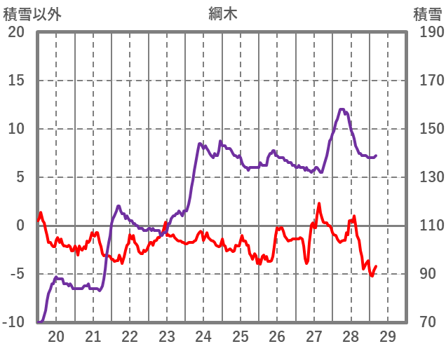 | 日 | 時 | 気温 | 降水 | 風向/風速 | 日照 | 積雪 | 降雪 |