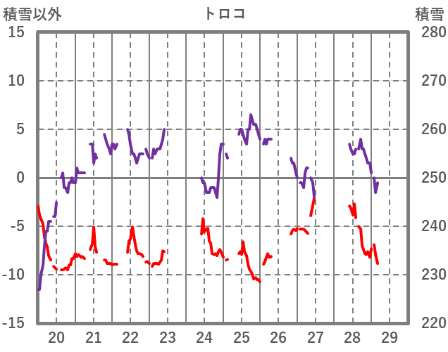 | 日 | 時 | 気温 | 降水 | 風向/風速 | 日照 | 積雪 | 降雪 |