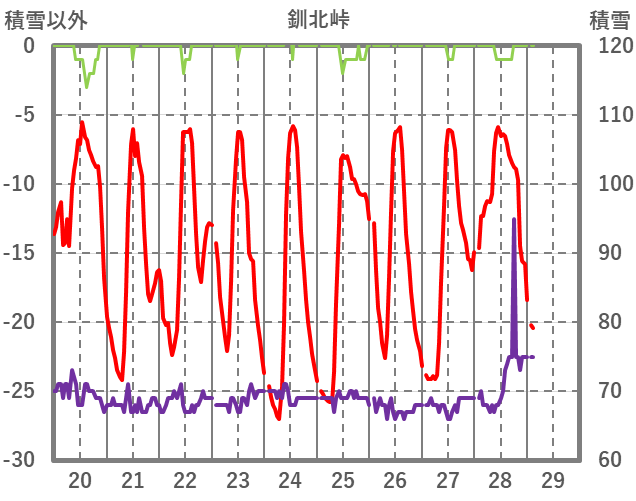 | 日 | 時 | 気温 | 降水 | 風向/風速 | 日照 | 積雪 | 降雪 |