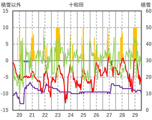 | 日 | 時 | 気温 | 降水 | 風向/風速 | 日照 | 積雪 | 降雪 |