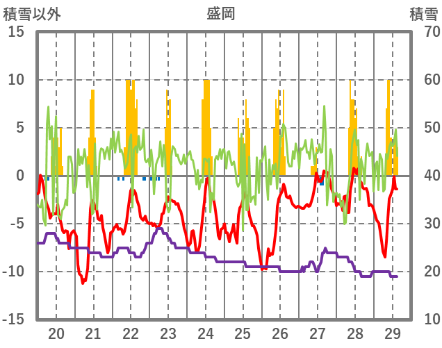 | 日 | 時 | 気温 | 降水 | 風向/風速 | 日照 | 積雪 | 降雪 |