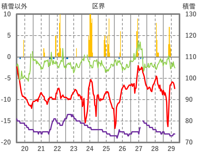 | 日 | 時 | 気温 | 降水 | 風向/風速 | 日照 | 積雪 | 降雪 |