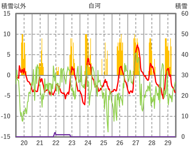 | 日 | 時 | 気温 | 降水 | 風向/風速 | 日照 | 積雪 | 降雪 |