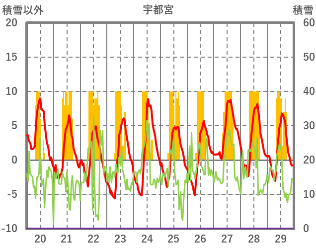 | 日 | 時 | 気温 | 降水 | 風向/風速 | 日照 | 積雪 | 降雪 |