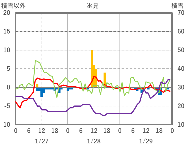 | 日 | 時 | 気温 | 降水 | 風向/風速 | 日照 | 積雪 | 降雪 |