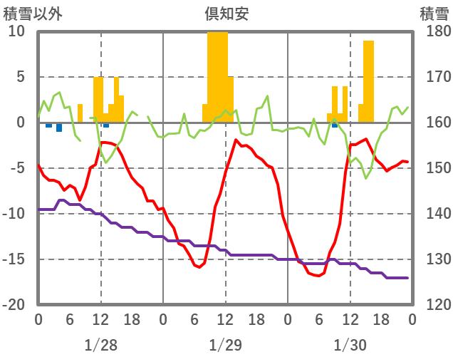 | 日 | 時 | 気温 | 降水 | 風向/風速 | 日照 | 積雪 | 降雪 |