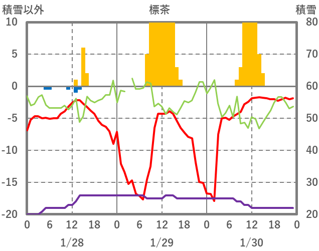 | 日 | 時 | 気温 | 降水 | 風向/風速 | 日照 | 積雪 | 降雪 |