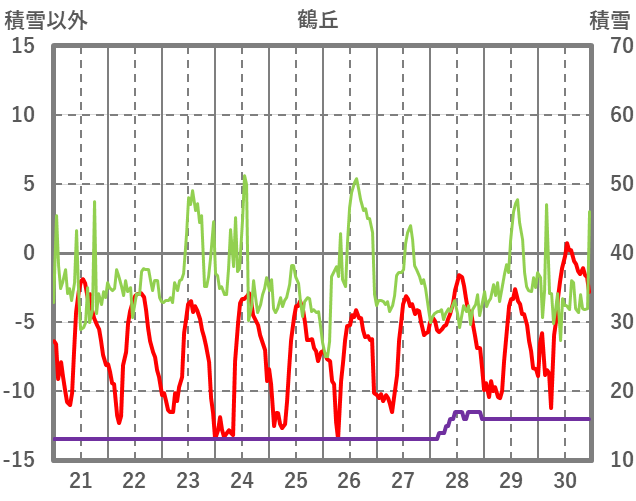 | 日 | 時 | 気温 | 降水 | 風向/風速 | 日照 | 積雪 | 降雪 |