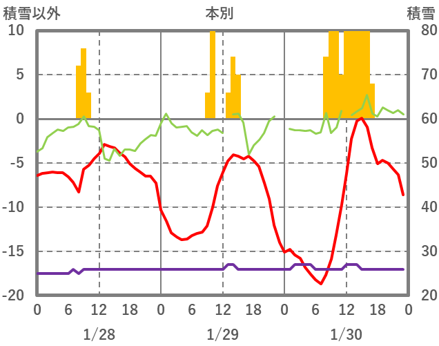 | 日 | 時 | 気温 | 降水 | 風向/風速 | 日照 | 積雪 | 降雪 |