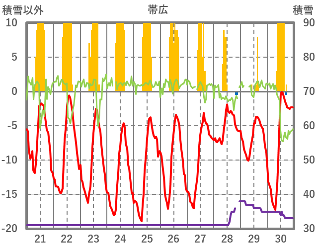 | 日 | 時 | 気温 | 降水 | 風向/風速 | 日照 | 積雪 | 降雪 |