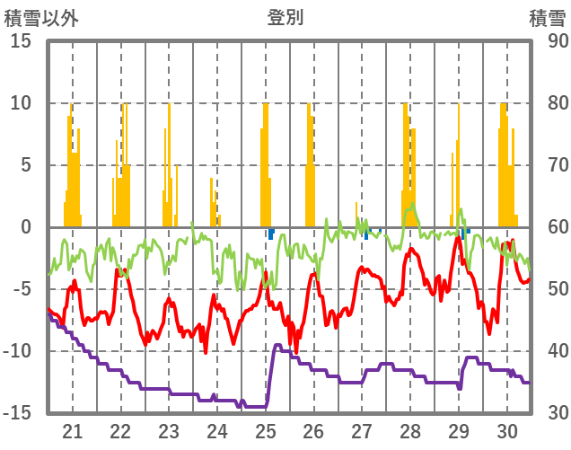| 日 | 時 | 気温 | 降水 | 風向/風速 | 日照 | 積雪 | 降雪 |