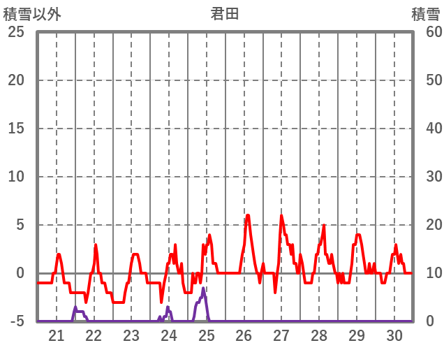 | 日 | 時 | 気温 | 降水 | 風向/風速 | 日照 | 積雪 | 降雪 |