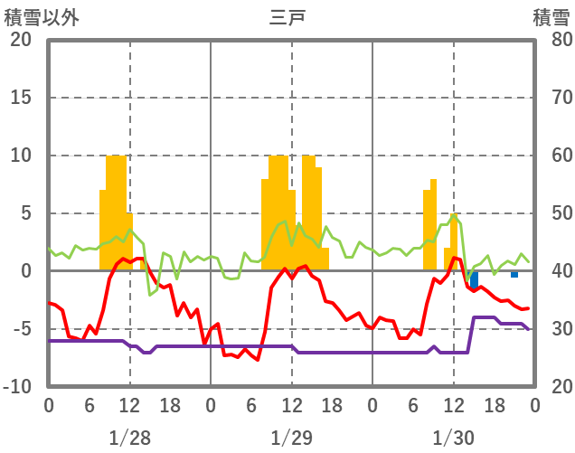 | 日 | 時 | 気温 | 降水 | 風向/風速 | 日照 | 積雪 | 降雪 |