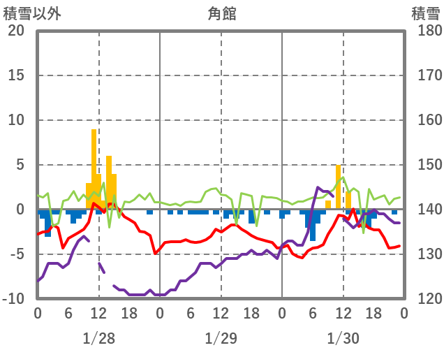 | 日 | 時 | 気温 | 降水 | 風向/風速 | 日照 | 積雪 | 降雪 |