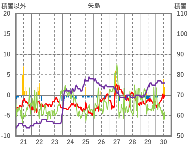 | 日 | 時 | 気温 | 降水 | 風向/風速 | 日照 | 積雪 | 降雪 |