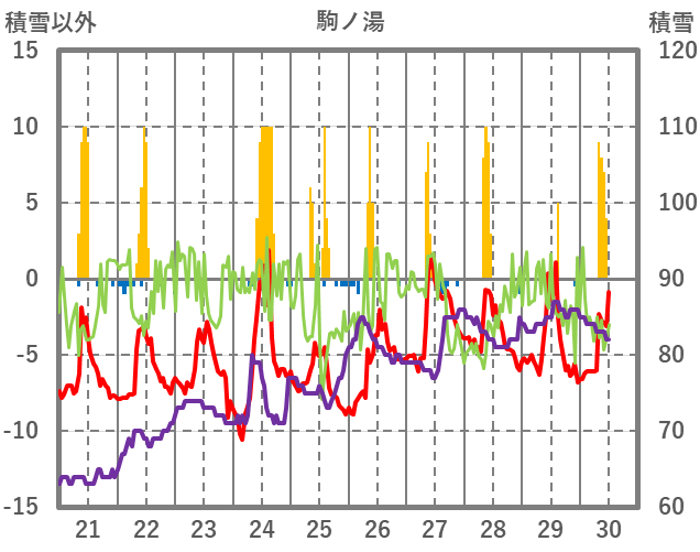 | 日 | 時 | 気温 | 降水 | 風向/風速 | 日照 | 積雪 | 降雪 |