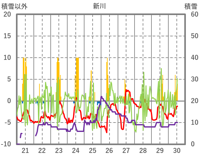 | 日 | 時 | 気温 | 降水 | 風向/風速 | 日照 | 積雪 | 降雪 |