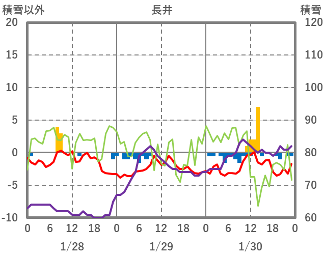 | 日 | 時 | 気温 | 降水 | 風向/風速 | 日照 | 積雪 | 降雪 |