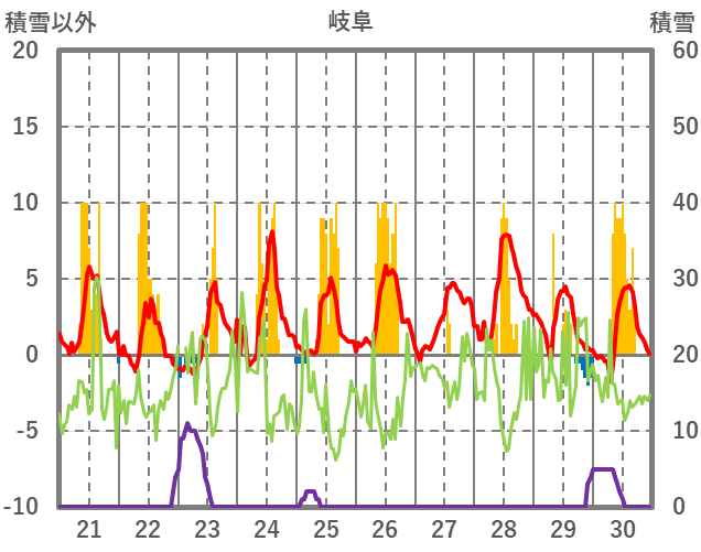 | 日 | 時 | 気温 | 降水 | 風向/風速 | 日照 | 積雪 | 降雪 |