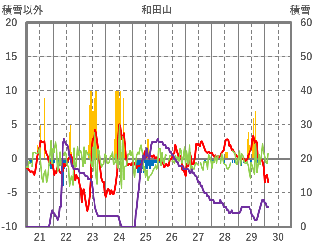 | 日 | 時 | 気温 | 降水 | 風向/風速 | 日照 | 積雪 | 降雪 |