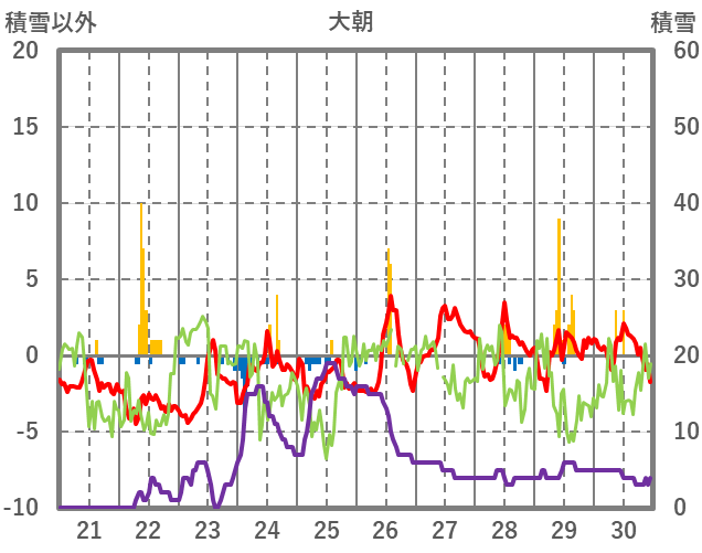 | 日 | 時 | 気温 | 降水 | 風向/風速 | 日照 | 積雪 | 降雪 |
