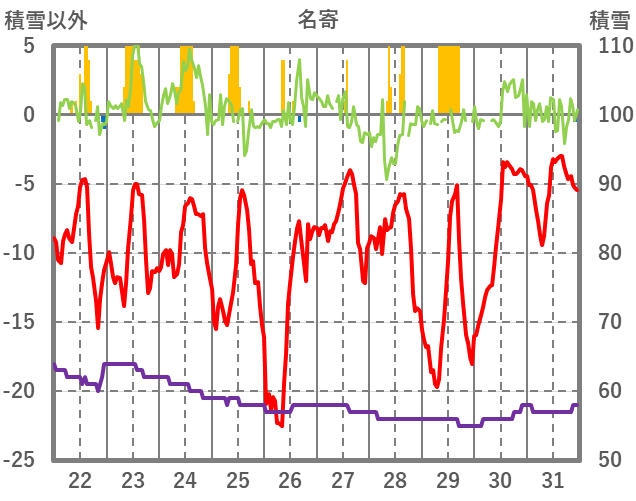 | 日 | 時 | 気温 | 降水 | 風向/風速 | 日照 | 積雪 | 降雪 |