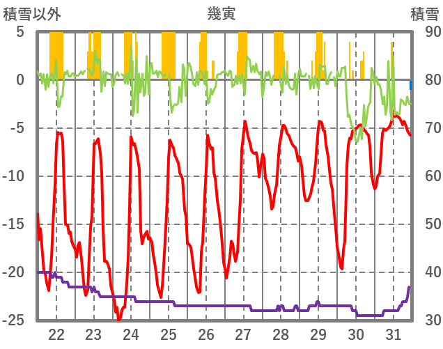 | 日 | 時 | 気温 | 降水 | 風向/風速 | 日照 | 積雪 | 降雪 |