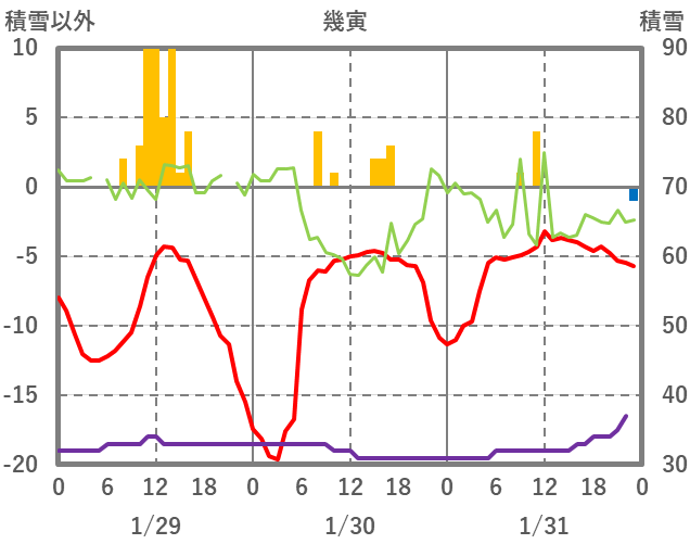 | 日 | 時 | 気温 | 降水 | 風向/風速 | 日照 | 積雪 | 降雪 |