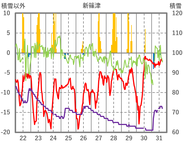 | 日 | 時 | 気温 | 降水 | 風向/風速 | 日照 | 積雪 | 降雪 |
