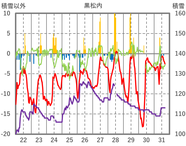 | 日 | 時 | 気温 | 降水 | 風向/風速 | 日照 | 積雪 | 降雪 |