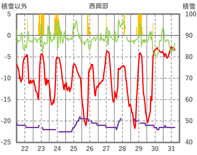 | 日 | 時 | 気温 | 降水 | 風向/風速 | 日照 | 積雪 | 降雪 |