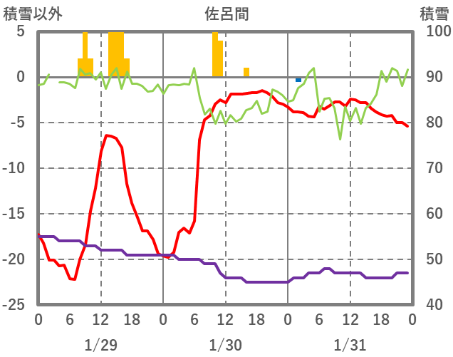 | 日 | 時 | 気温 | 降水 | 風向/風速 | 日照 | 積雪 | 降雪 |