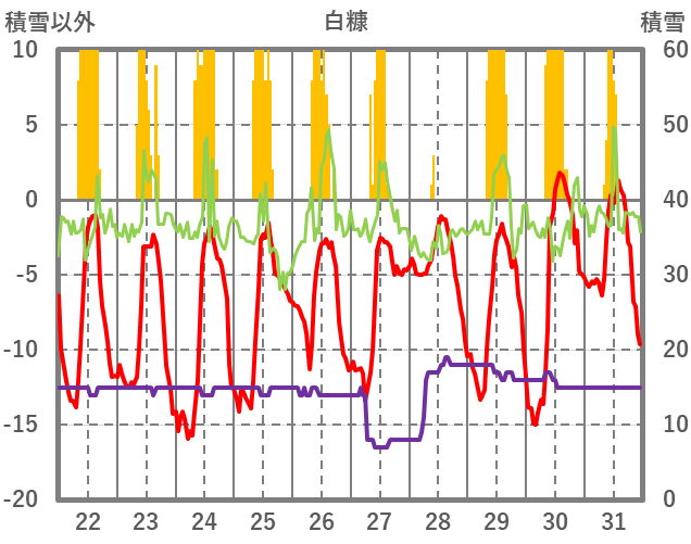 | 日 | 時 | 気温 | 降水 | 風向/風速 | 日照 | 積雪 | 降雪 |