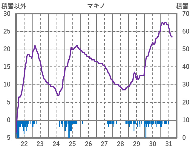 | 日 | 時 | 気温 | 降水 | 風向/風速 | 日照 | 積雪 | 降雪 |