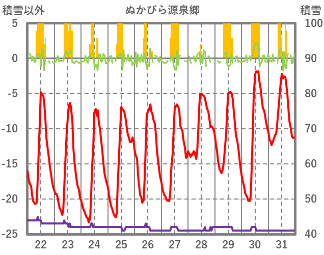 | 日 | 時 | 気温 | 降水 | 風向/風速 | 日照 | 積雪 | 降雪 |