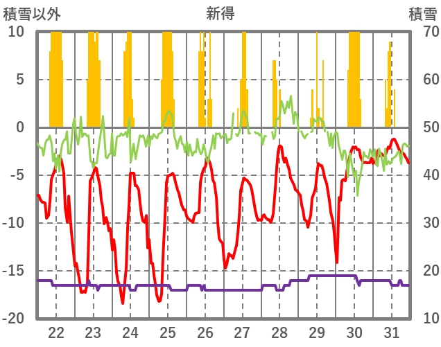 | 日 | 時 | 気温 | 降水 | 風向/風速 | 日照 | 積雪 | 降雪 |