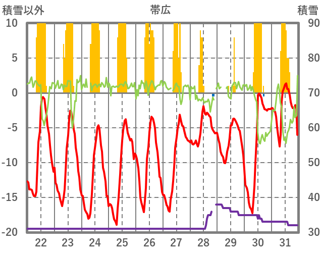 | 日 | 時 | 気温 | 降水 | 風向/風速 | 日照 | 積雪 | 降雪 |