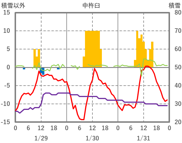| 日 | 時 | 気温 | 降水 | 風向/風速 | 日照 | 積雪 | 降雪 |