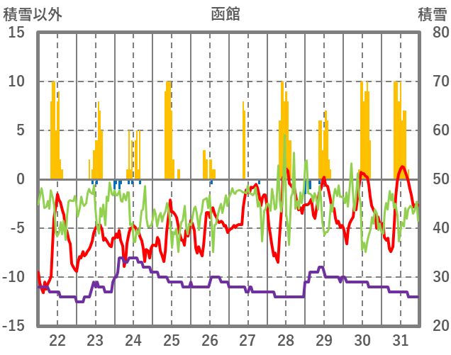 | 日 | 時 | 気温 | 降水 | 風向/風速 | 日照 | 積雪 | 降雪 |