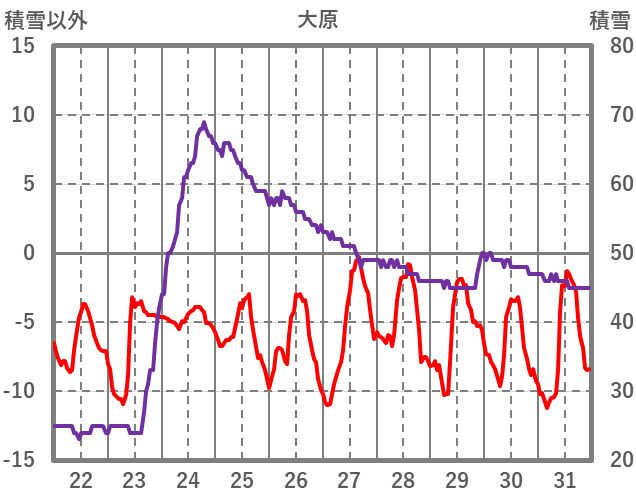 | 日 | 時 | 気温 | 降水 | 風向/風速 | 日照 | 積雪 | 降雪 |