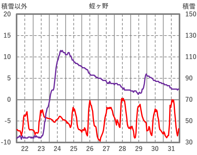 | 日 | 時 | 気温 | 降水 | 風向/風速 | 日照 | 積雪 | 降雪 |