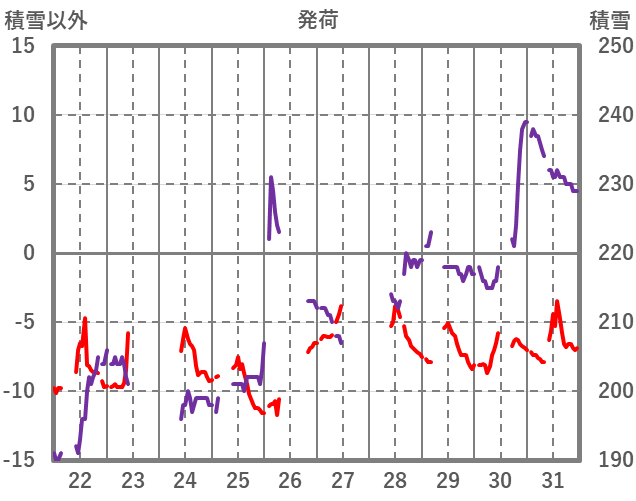 | 日 | 時 | 気温 | 降水 | 風向/風速 | 日照 | 積雪 | 降雪 |