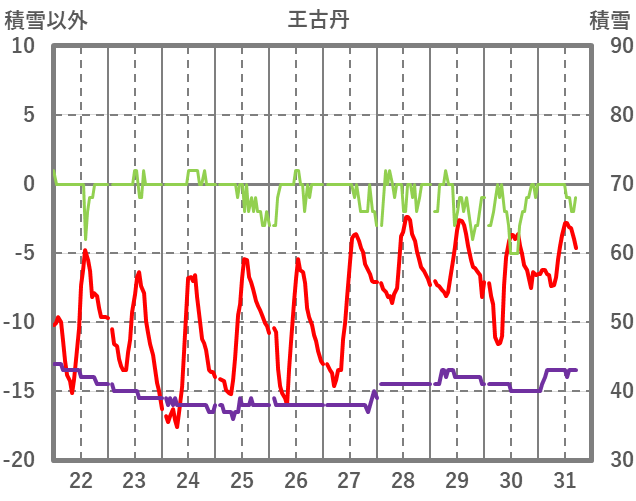 | 日 | 時 | 気温 | 降水 | 風向/風速 | 日照 | 積雪 | 降雪 |