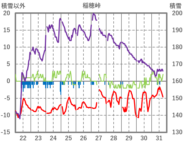 | 日 | 時 | 気温 | 降水 | 風向/風速 | 日照 | 積雪 | 降雪 |