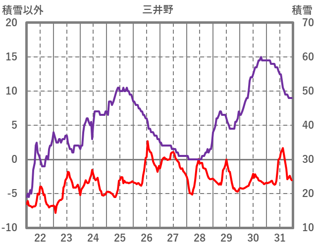 | 日 | 時 | 気温 | 降水 | 風向/風速 | 日照 | 積雪 | 降雪 |