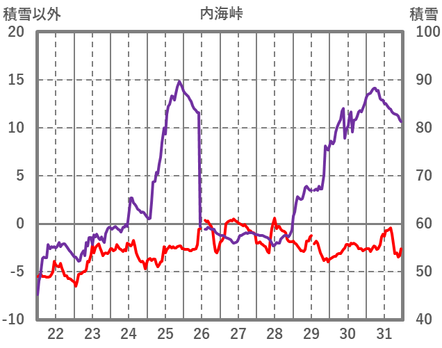 | 日 | 時 | 気温 | 降水 | 風向/風速 | 日照 | 積雪 | 降雪 |