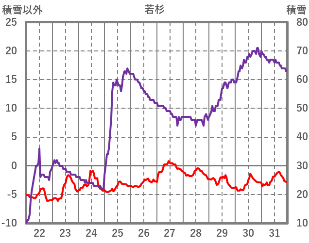 | 日 | 時 | 気温 | 降水 | 風向/風速 | 日照 | 積雪 | 降雪 |