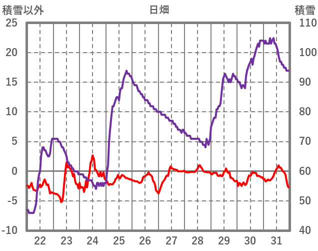 | 日 | 時 | 気温 | 降水 | 風向/風速 | 日照 | 積雪 | 降雪 |
